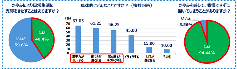 製薬会社が行ったアンケート調査によると、全体の95.2%の方が「例年、秋冬の時期に乾燥による身体のかゆみを感じる」と回答。かゆみによって日常に支障をきたすという方は40.4%に達しました。「集中力が低下する」「寝つきが悪くなる」「服を着るとチクチクする」という声が多く、何かしらの不快感を覚える人が多いようです。また、かゆみを感じたとき我慢できずに掻いてしまう人は9割以上という結果に。本来、かゆみは掻くと悪化するため、掻かないことが重要ですが、現実には、かゆみを我慢することは難しいようです。