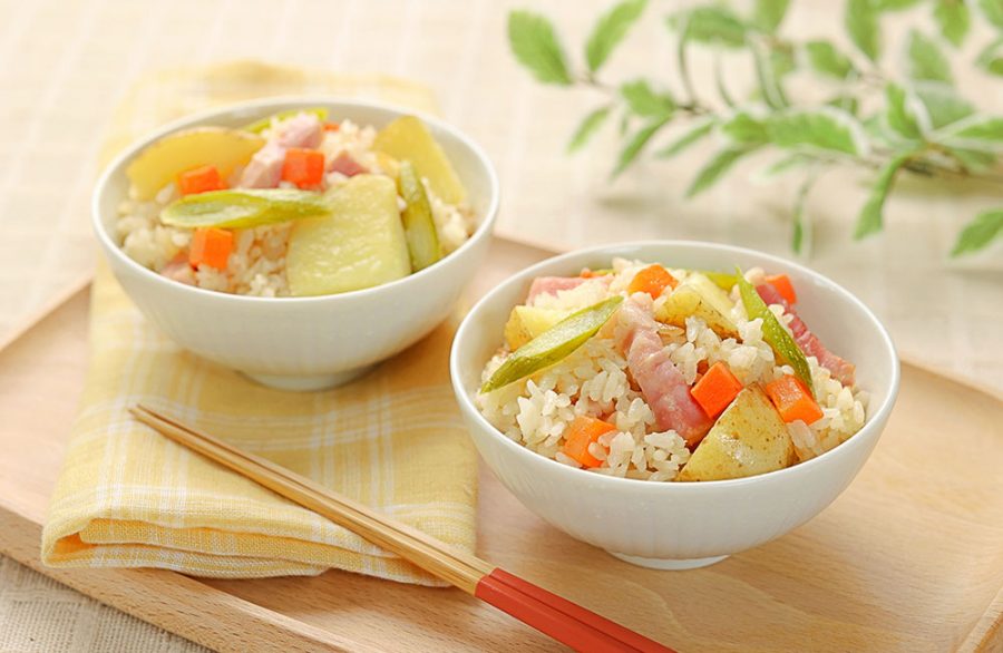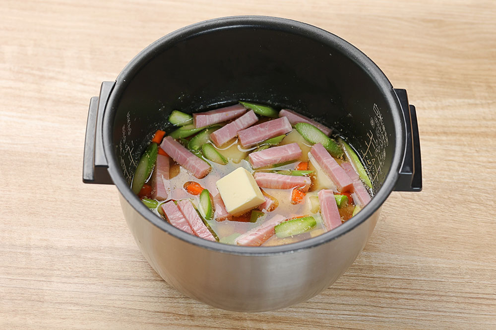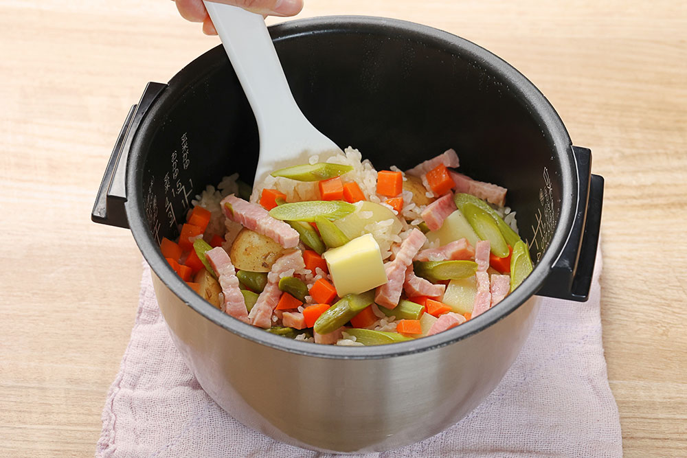 炊飯釜に米を入れ、Aを加えて水を1.5合の目盛りまで注いで混ぜ、新じゃが、ニンジン、アスパラガス、ベーコンを加え、バターをのせて炊く。