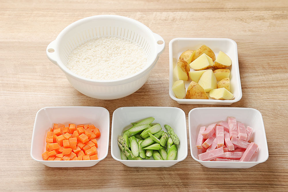 新じゃがは皮つきのまま6等分に切る。ニンジンは1cm角に切る。アスパラガスは斜め切りにする。ベーコンは拍子切りにする。