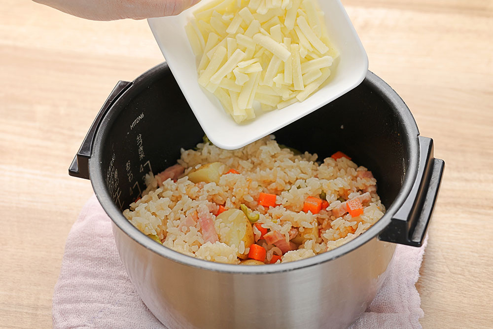 チーズを加えてリゾットのように楽しむことができます。炊き上がってバターを加えるときに、粉チーズやピザ用チーズを加えて混ぜ合わせ、チーズを溶かすだけ。大人も子どももおいしく楽しめますよ!