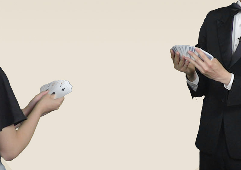 トランプを2組用意します。観客(相手)1人を指名し、マジックへの協力をお願いします。