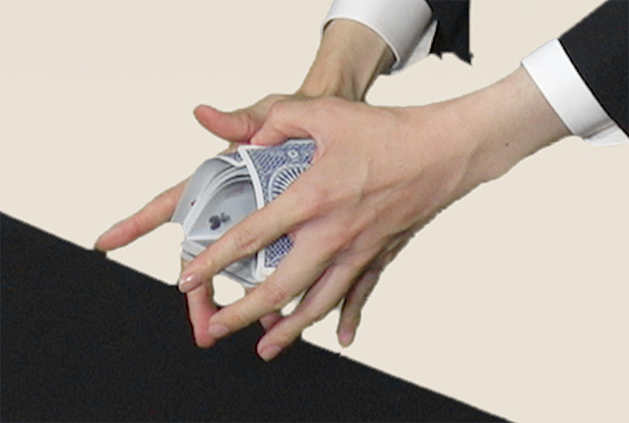 最後の一束が手元にある状態で、「置いた一番上のカードを覚えましょう」と言って、置いた束の一番上のカードを覚えてもらいます。こちらも一番のカードをめくり、覚えるフリをします。覚えてもらったら、テーブルの束の一番上に戻してもらい、その上に手に残ったカード束を重ねて置きます。