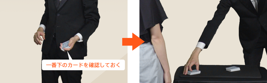 束の一番下のカードは、相手にまねしてもらう動作の中でさりげなく確認するのがこのマジックのポイントです。カードを広げたり、シャッフル後に揃えたり、自然に確認できる動作を取り入れましょう。