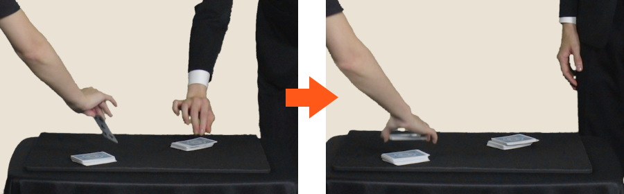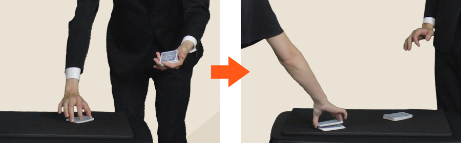 相手にまねしてもらいながら、トランプセットを相手と交換します。このとき、渡すトランプセットの一番下のカードをさりげなく(相手から見えないように)確認し、覚えておきます。こうすることで、相手に渡すトランプセットの一番下のカードを把握しておくことができます。