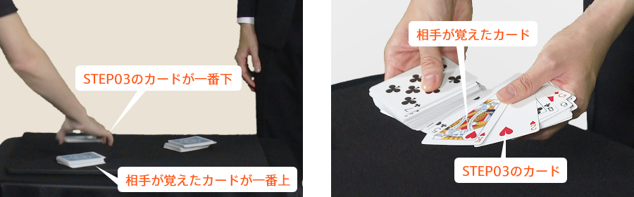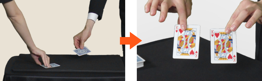 再度カード束を交換し、「さきほど覚えたカードをお互い出してみましょう」と言って、覚えてもらったカードを裏返した状態でテーブルに出してもらいます。自分の手札を広げて見たとき、STEP03で覚えたカードの右側に相手の覚えたカードが来ているはずです。このカードを裏返して置き、2枚同時に表にします。同じカードがテーブルに出揃えば、相手は驚くこと間違いなしです!