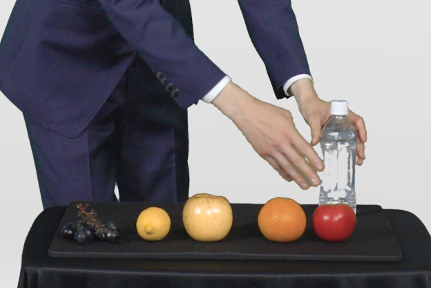 フルーツを並べて置き、「液体を使った予言マジックです」などと観客(相手)に声をかけ、ペットボトルは端に置いておきます。