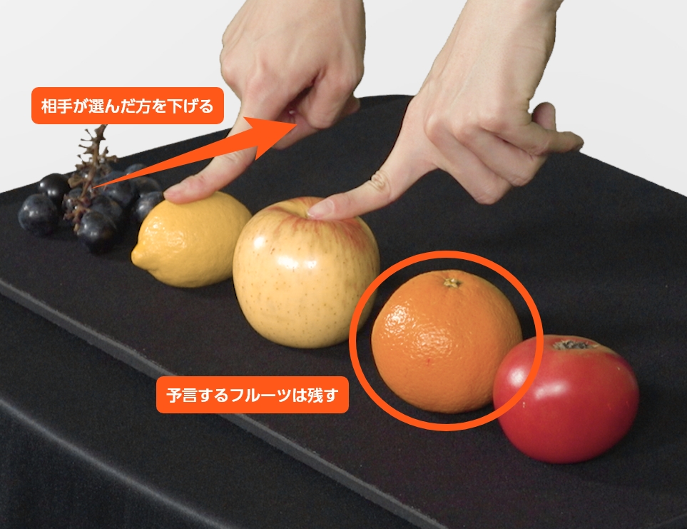 今度は、相手に好きなフルーツを2つ選んでもらい、その中から演者は1つ選んで下げます。このとき、演者は予言するフルーツが残るように選びます。