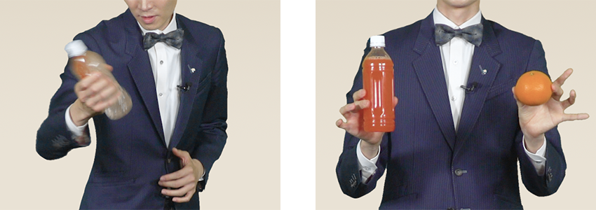 「このフルーツが選ばれることは最初から分かっていたんです」などと言って、ペットボトルを静かに手に取り、勢いよく振ります。