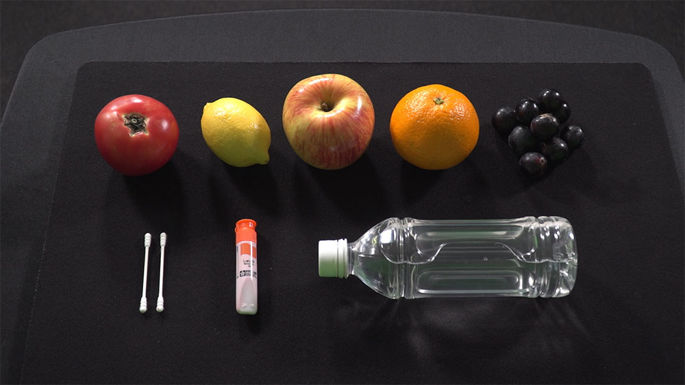 フルーツを並べて置き、「液体を使った予言マジックです」などと観客(相手)に声をかけ、ペットボトルは端に置いておきます。