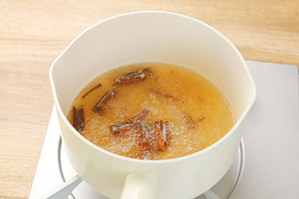 1と水を小鍋に入れ、強火にかける。沸騰したら中火に落とし、2分加熱する。