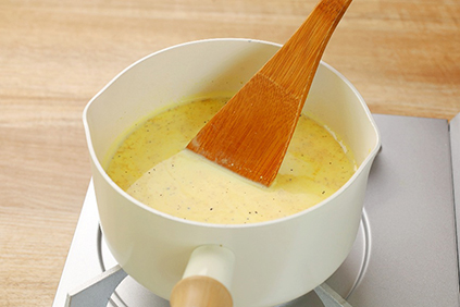2に牛乳とAを加えて木べらで混ぜながら強火にかける。沸騰直前で弱火にし、煮立たせないように5分温める。